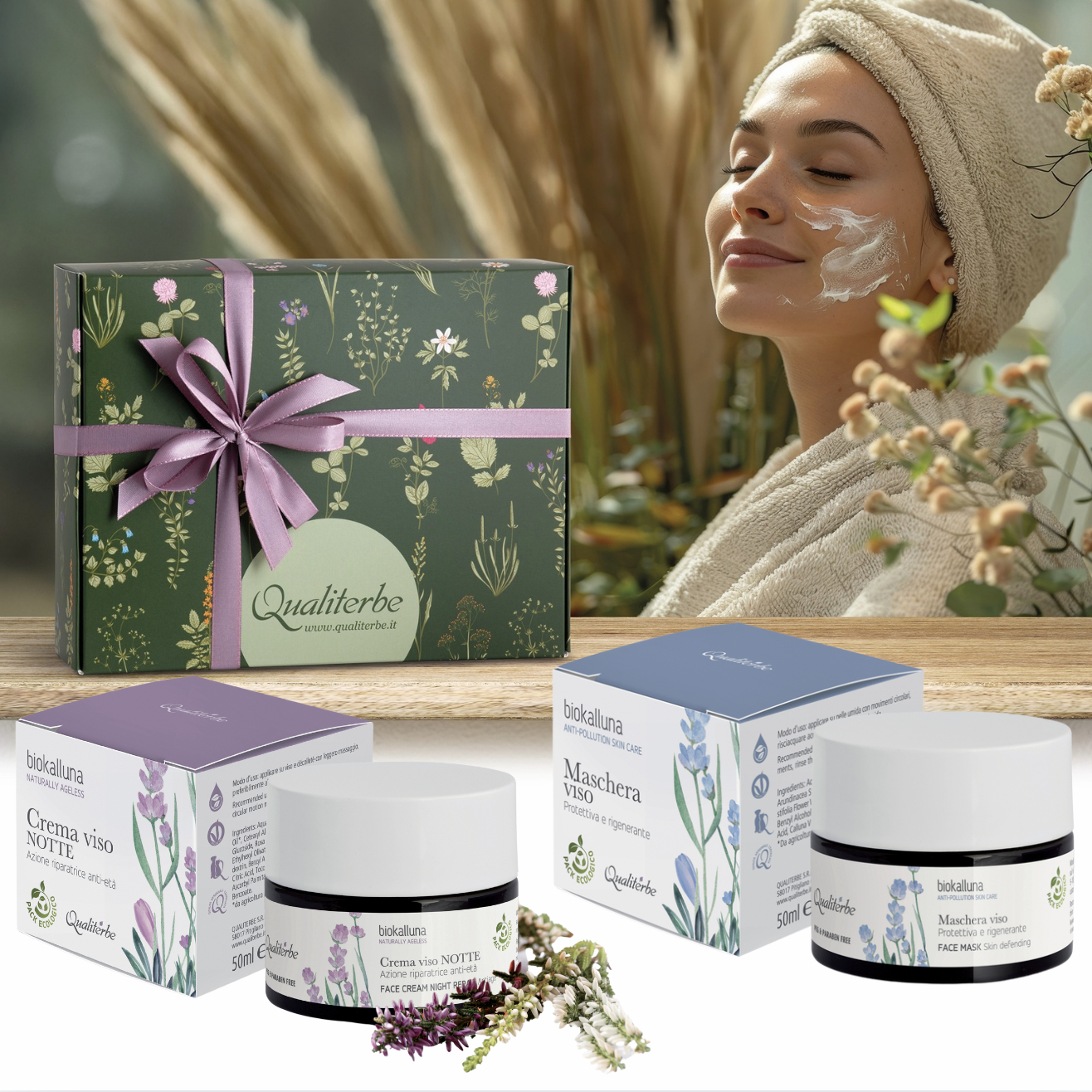 Scegli un rituale notturno di lusso per risvegliarti con una pelle riposata, levigata e splendidamente rinnovata! I prodotti "Notte di Bellezza" sono studiati per rigenerare e proteggere, agisccono mentre dormi per una bellezza che si rivela ogni mattina. Crema Viso Notte Riparatrice Anti-Età Biokalluna: Lavora in profondità, nutre e rigenera la pelle, donando elasticità e morbidezza. Maschera Viso Protettiva e Rigenerante Biokalluna: Ripara e fortifica la pelle, aiutandola a recuperare tonicità e freschezza. Il kit include spedizione gratuita e una confezione regalo elegante.
