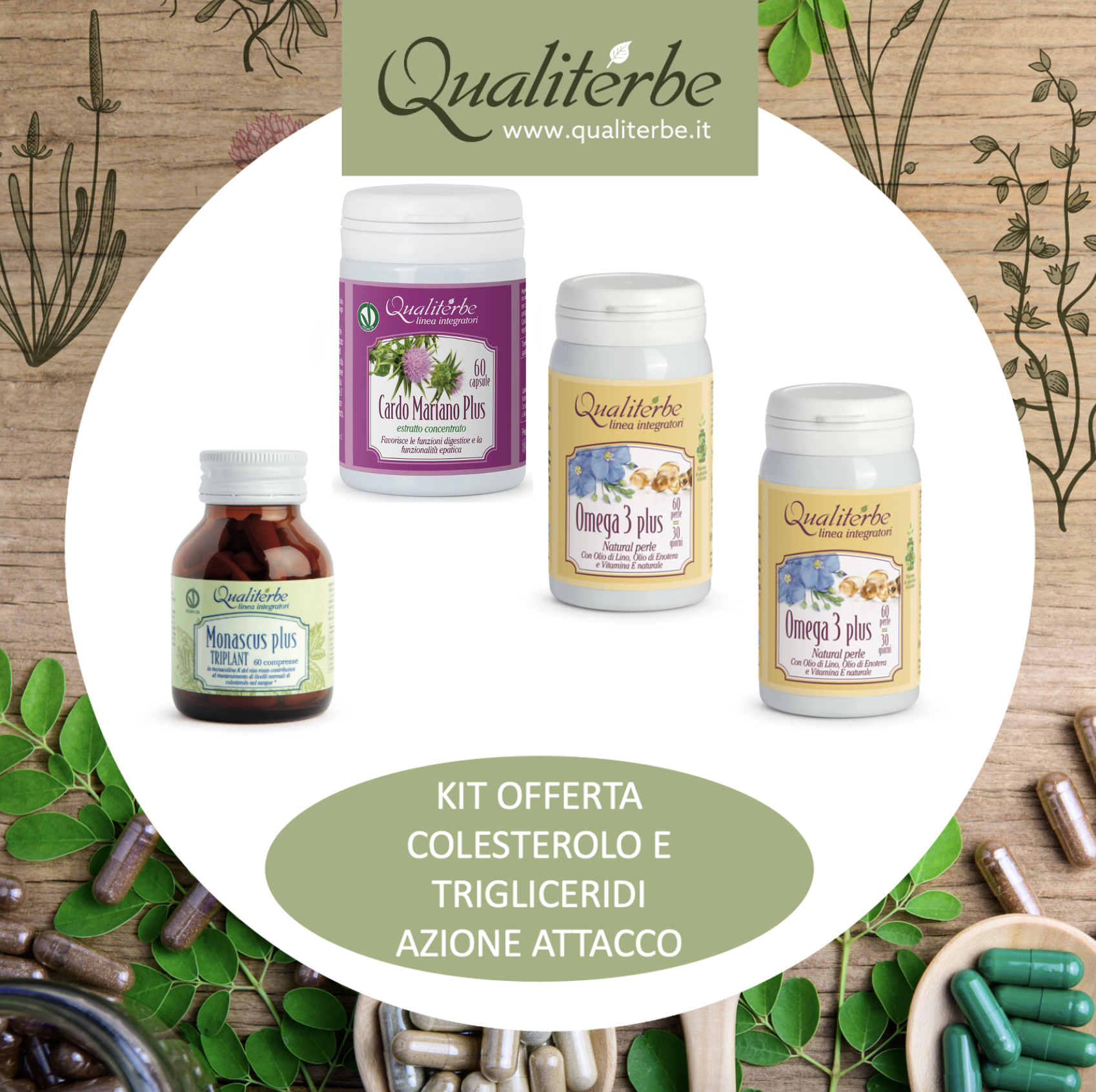 Integratore alimentare naturale per il corretto e sicuro controllo del colesterolo, a base di estratti vegetali selezionati, titolati e standardizzati di riso rosso fermentato ad attività ipocolesterolemizzante, di carciofo per l'azione protettiva del fegato, di berberis che migliora la capacità del fegato di metabolizzare il colesterolo e di fieno greco che contiene fibre, mucillagini, e saponine che limitano l'assorbimento del colesterolo a livello intestinale e hanno effetti positivi sul profilo lipidico.