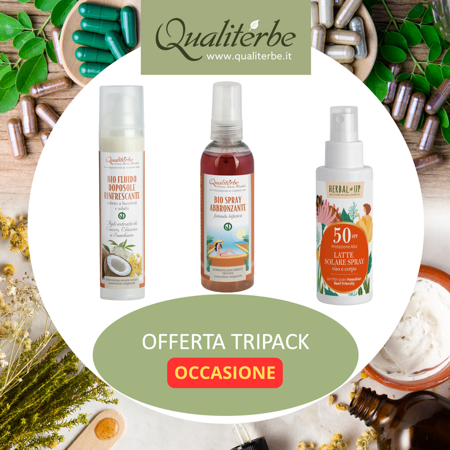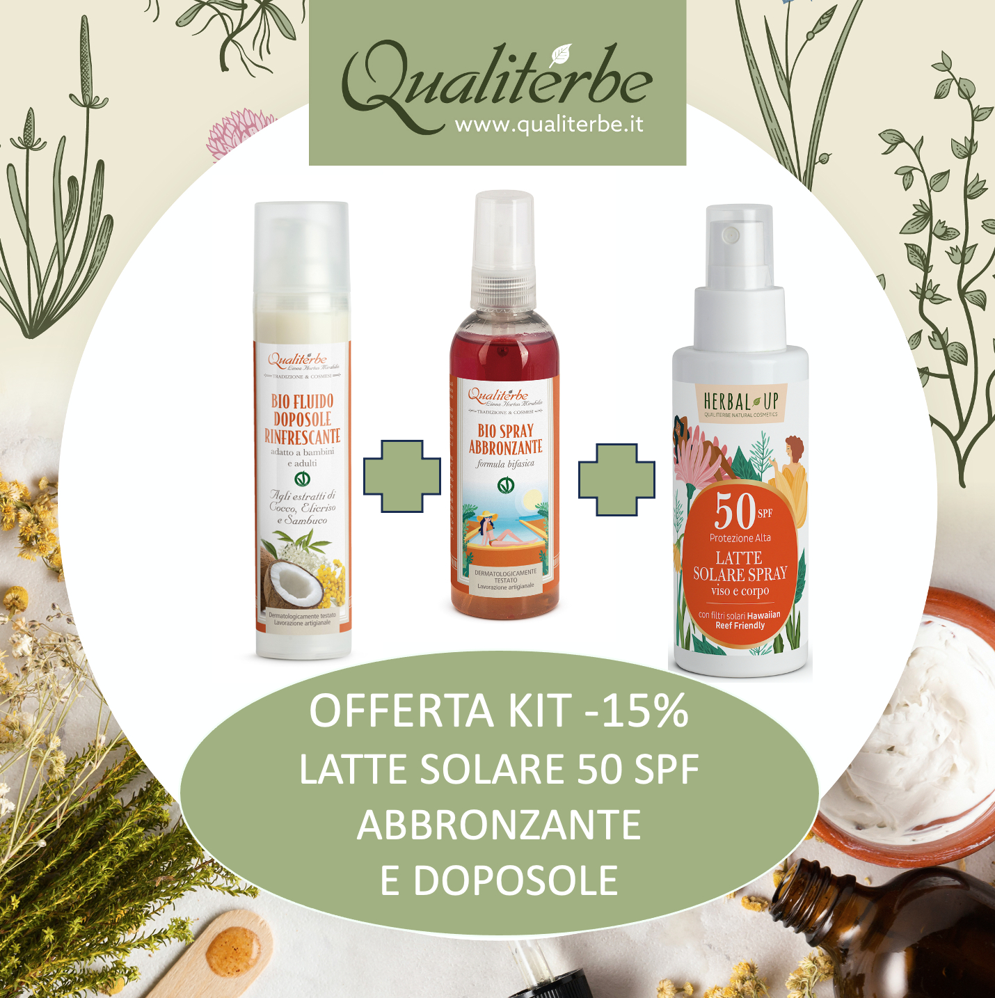 Il Kit Latte Solare SPF 50 di Qualiterbe include tre prodotti essenziali per una protezione solare completa:
