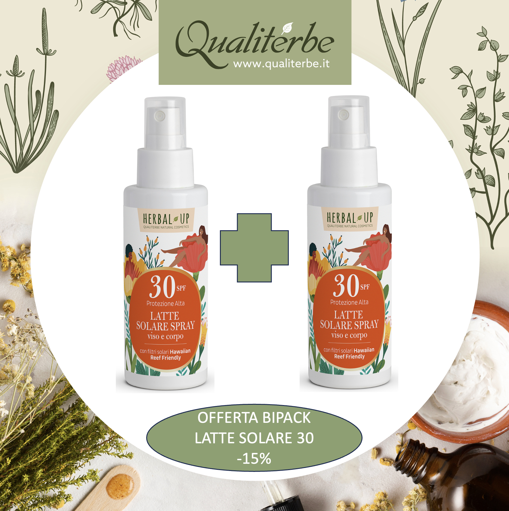 Doppio latte solare SPF 30, protezione UVA-UVB, per adulti e bambini, con ingredienti naturali. L'Offerta Bipack Latte Solare di Qualiterbe include due latti solari con SPF 30, formulati per offrire una protezione solare completa per tutta la famiglia. Adatti a tutti i tipi di pelle, questi latti solari forniscono una protezione UVA-UVB ad ampio spettro, ideale per adulti e bambini. Dermatologicamente testati e realizzati con emulsionanti di origine naturale, sono sicuri e efficaci. I filtri solari utilizzati sono approvati dall'Hawaiian Reef Friendly Act, garantendo un prodotto rispettoso dell'ambiente marino.