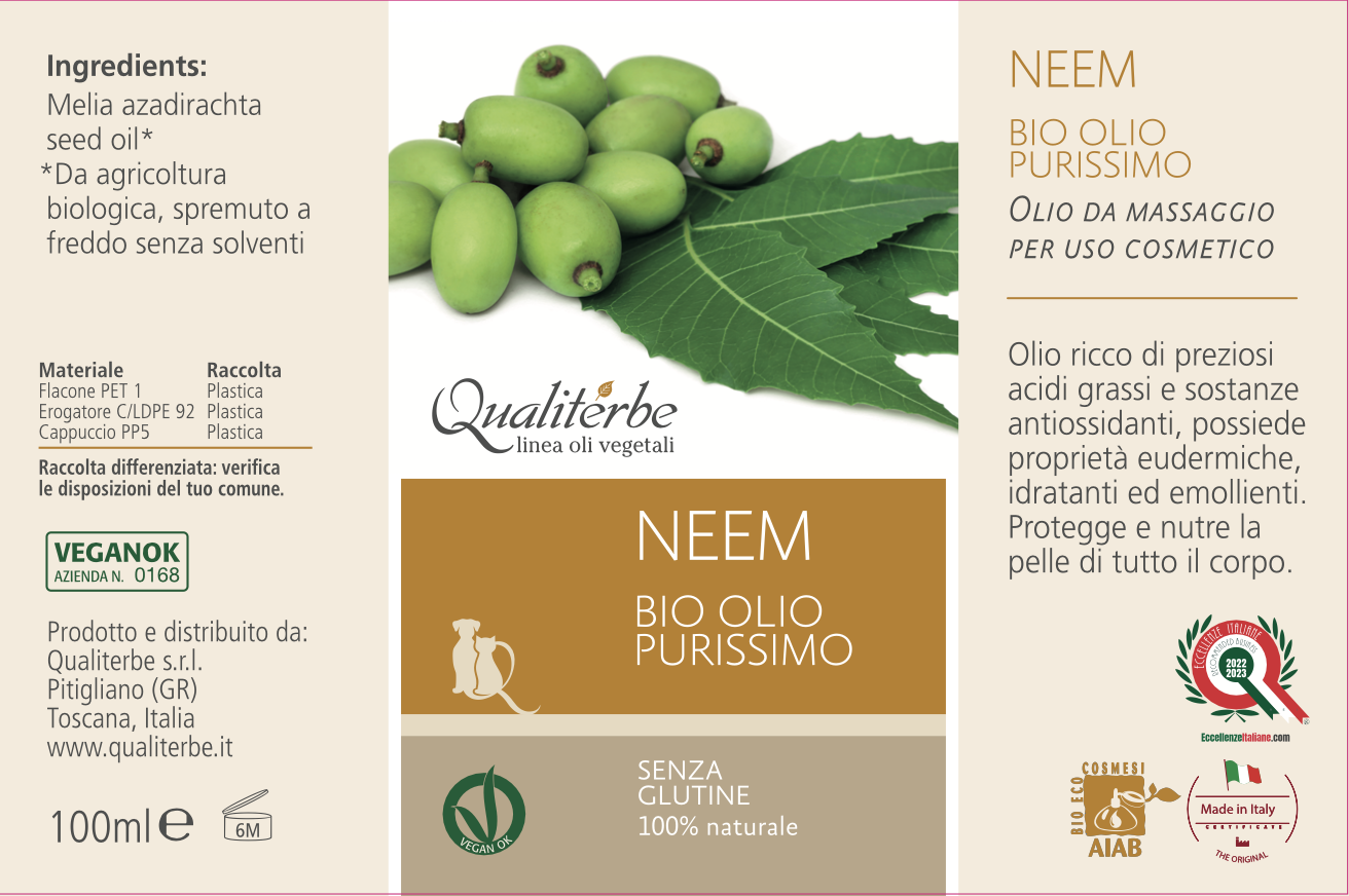 Consolidato da un’antica tradizione d’uso, l’olio di Neem possiede proprietà eudermiche, idratanti ed emollienti, dovute alla ricchezza di composti attivi, tra cui acidi grassi, azadiractina, nimbina, flavonoidi, carotenoidi e vitamina E, che lo rendono particolarmente indicato per la cura della pelle e dei capelli. Inoltre, l’olio di Neem viene ampiamente impiegato come repellente naturale in virtù delle sue proprietà insetticide, antiparassitarie ed antimicotiche.