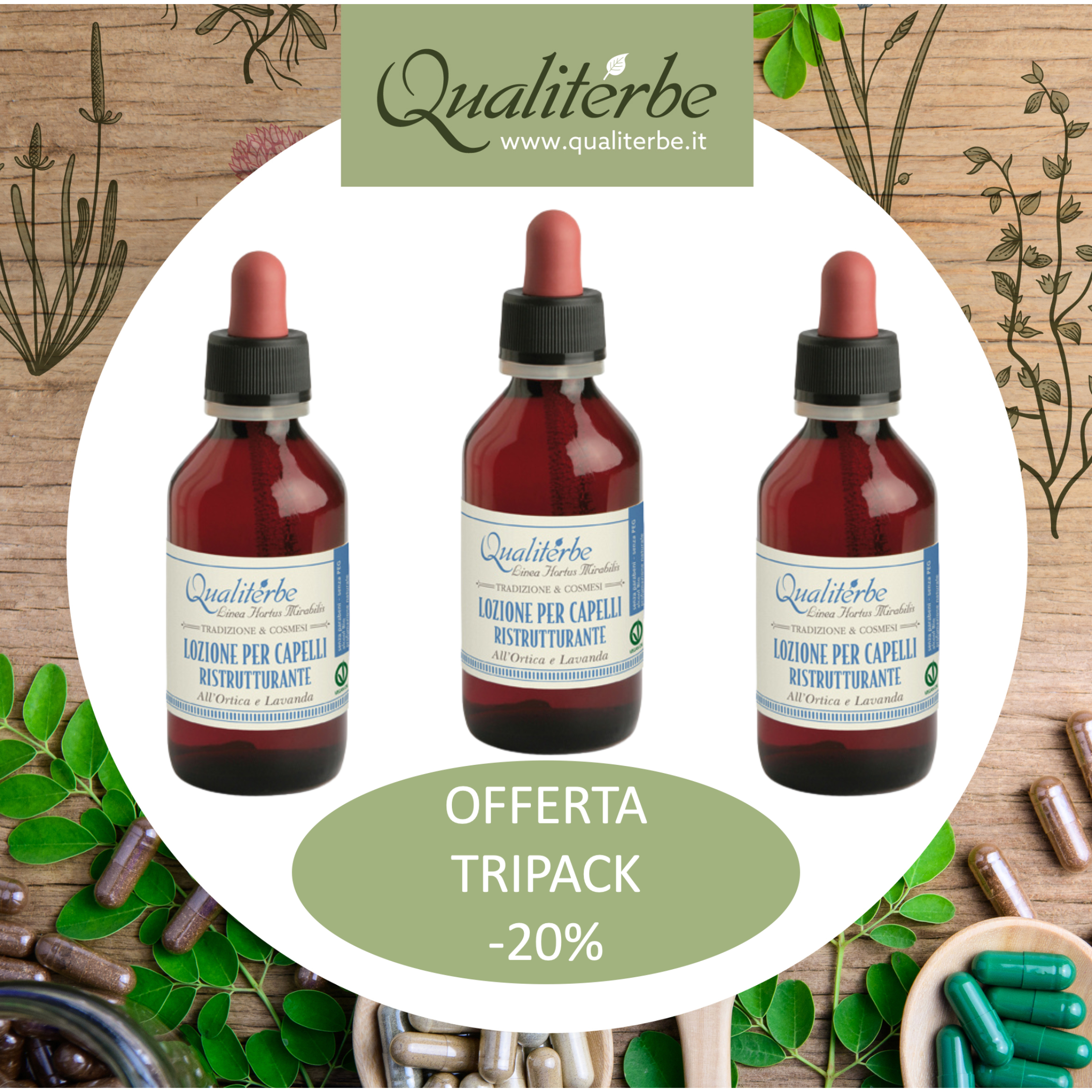 La sinergia degli estratti idroalcolici ottenuti delle foglie fresche di Ortica, Edera e dei fiori di Lavanda, è da sempre utilizzato per stimolare l’attività del bulbo pilifero, riducendo la caduta del capello e svolgendo un’azione ristrutturante e normalizzante, grazie alla ricchezza in vitamine, sali minerali, clorofilla e sostanze azotate presenti.