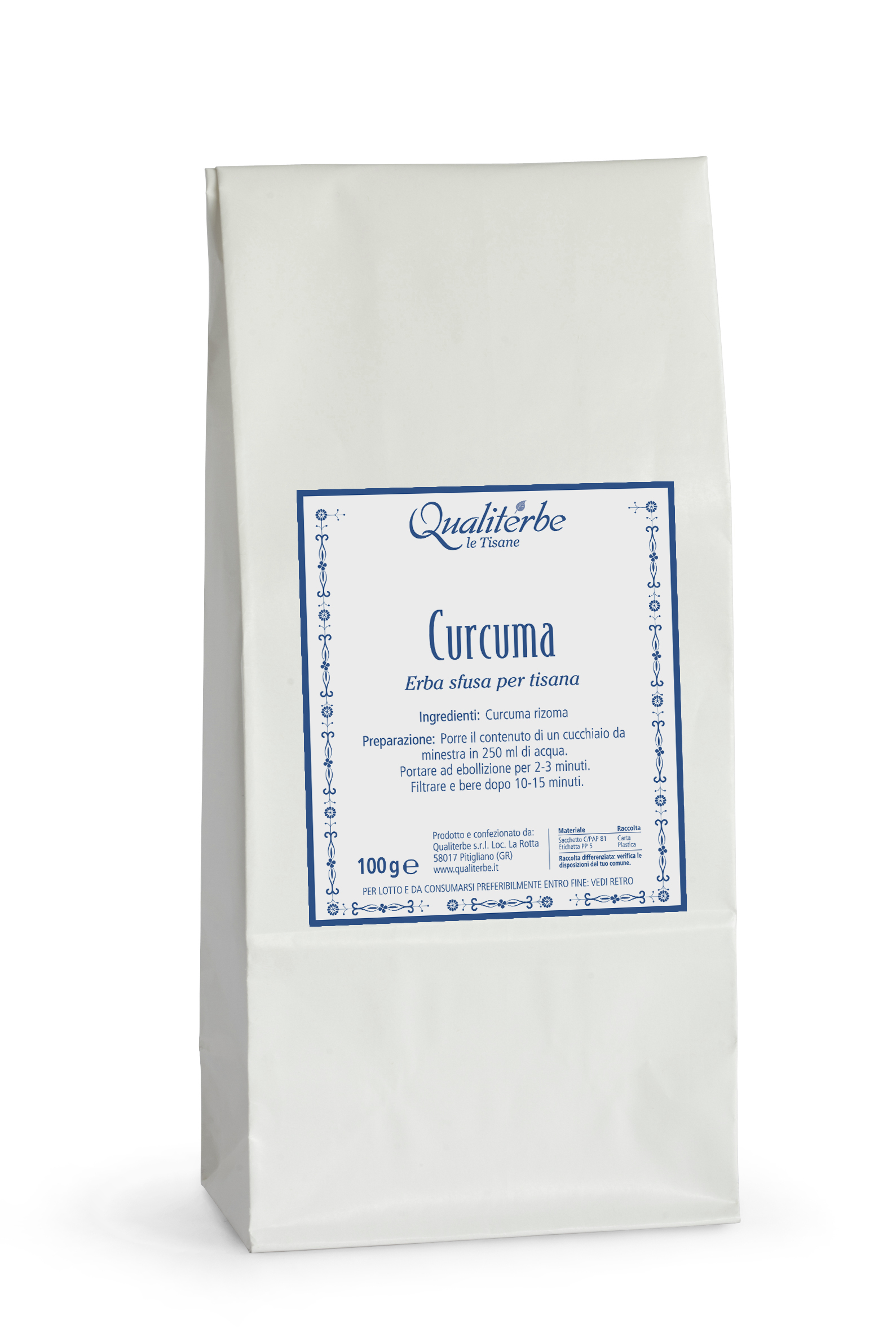100 gr. di prodotto sfuso in sacchetto di carta doppiostrato speciale per alimenti, salva freschezza e salva fragranza.