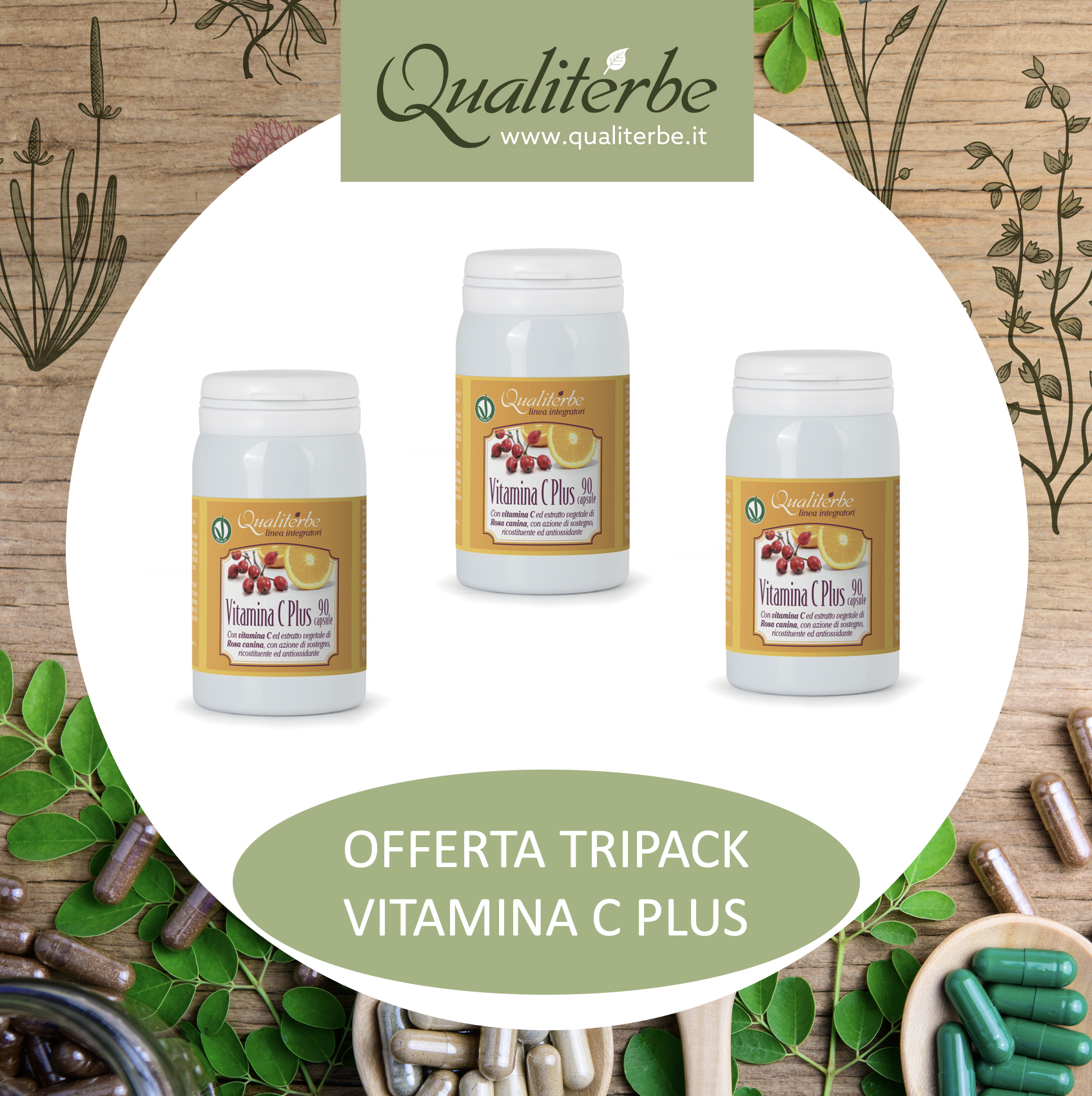 Tripack Vitamina C Plus di Qualiterbe include tre confezioni di integratori alimentari per sostenere l'organismo, migliorare le difese immunitarie e contrastare lo stress ossidativo. Ogni confezione contiene 90 capsule di vitamina C arricchite con estratto di Rosa Canina, noto per le sue proprietà antiossidanti e antinfiammatorie. Ideale per anziani, fumatori e soggetti con basse difese immunitarie. Certificato Vegan OK, senza OGM, conservanti e coloranti.